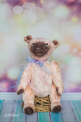 Шубка из плюша, цвета розвого жемчуга. Крепления 5-ти шплинтовое. Имеет стеклянные глазки и кокетливые снежинки из чешского бисера и органзовые ленты. Тонирована проф. масляными красками.